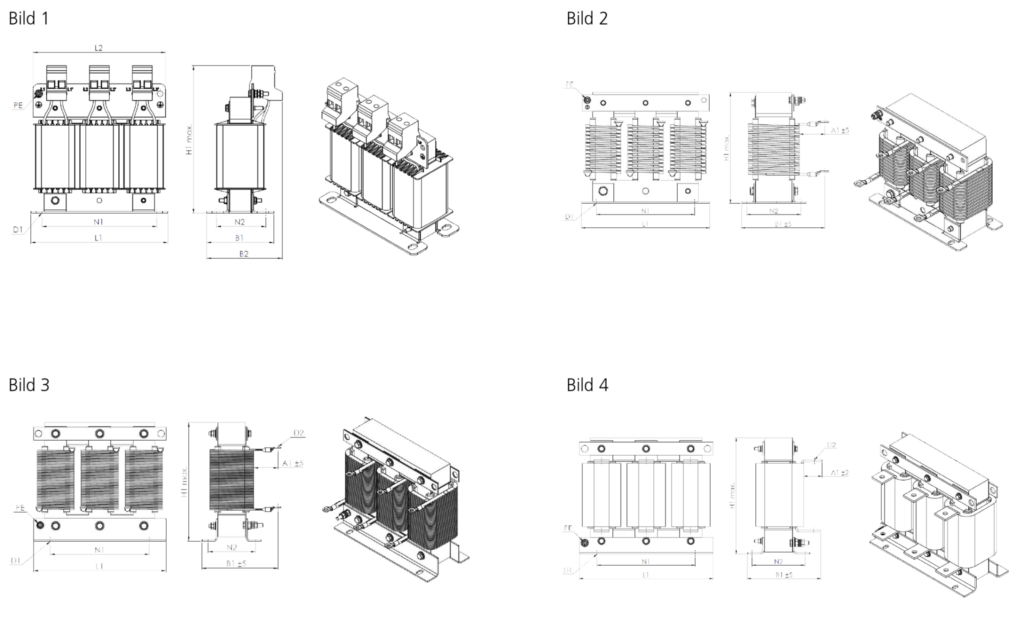 | Türü | Uzunluk L1 [mm] | Uzunluk L2 [mm] | Genişlik B1 [mm] | Genişlik B2 [mm] | Yükseklik maks. H1 [mm] | Sabitleme N1 [mm] | Sabitleme N2 [mm] | Sabitleme D1 [mm x mm] | Terminal/Kablo pabucu [mm²] | Açı [mm x mm] | Bağlantı A1 [mm] | Bağlantı D2 [mm] | PE Ø [mm] |